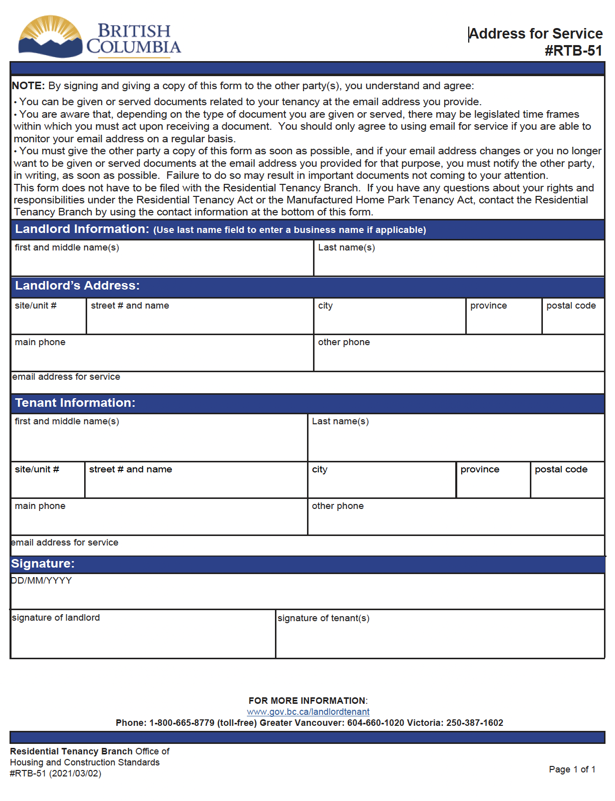- 입주 통지: 임대인은 RTB-51 서류를 사용하여 세입자에게 점검 또는 유지 보수 작업에 대한 통지를 보낼 수 있습니다. 이는 전화나 이메일로 통지가 어려운 경우 유용합니다. 법적으로 최소 24시간 전에 서면 통지가 필요합니다 (LandlordBC).