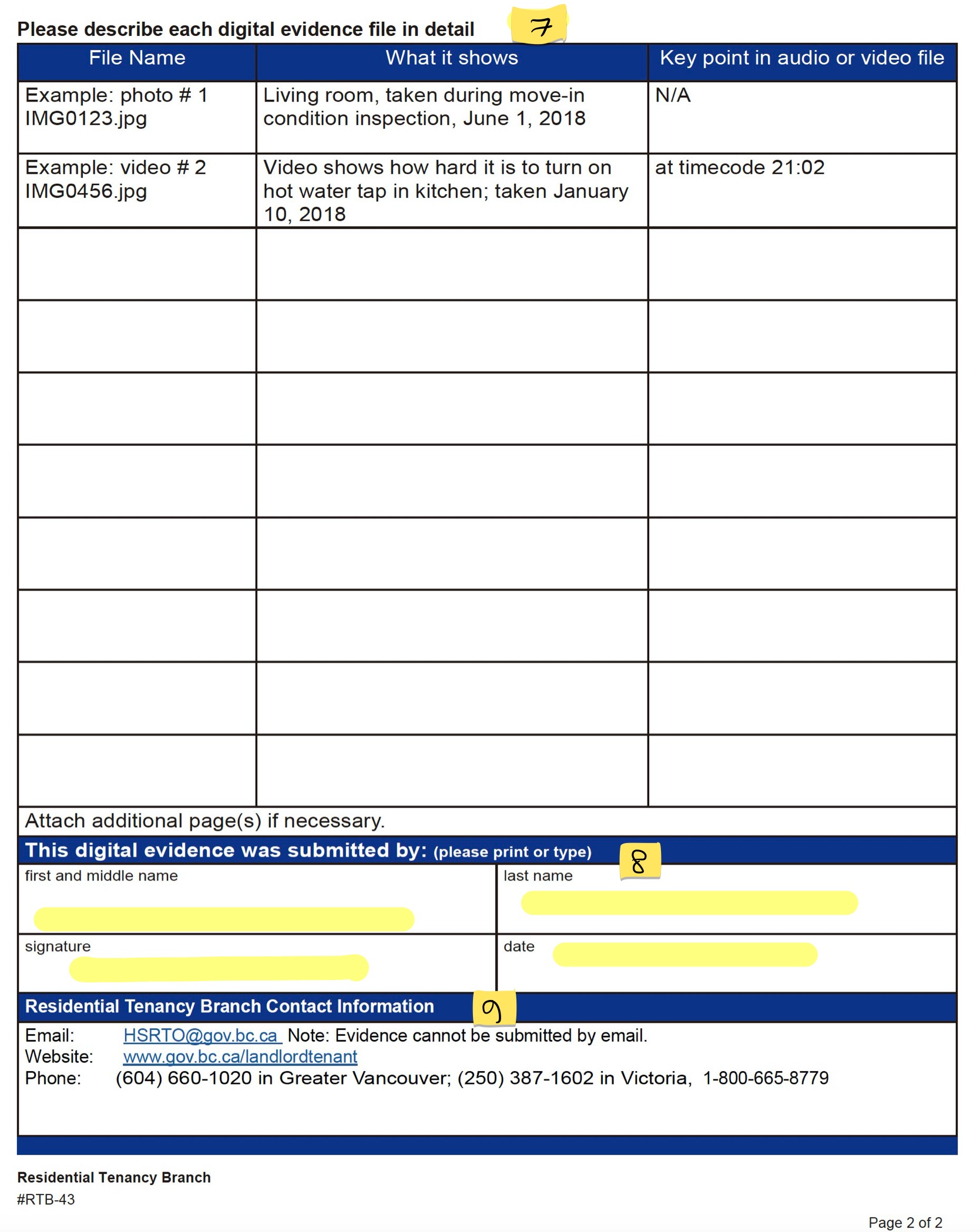 - 디지털 증거가 청문회에서 고려되기 위해서는 다음의 Residential Tenancy Branch (RTB) 절차 규정을 충족해야 합니다: