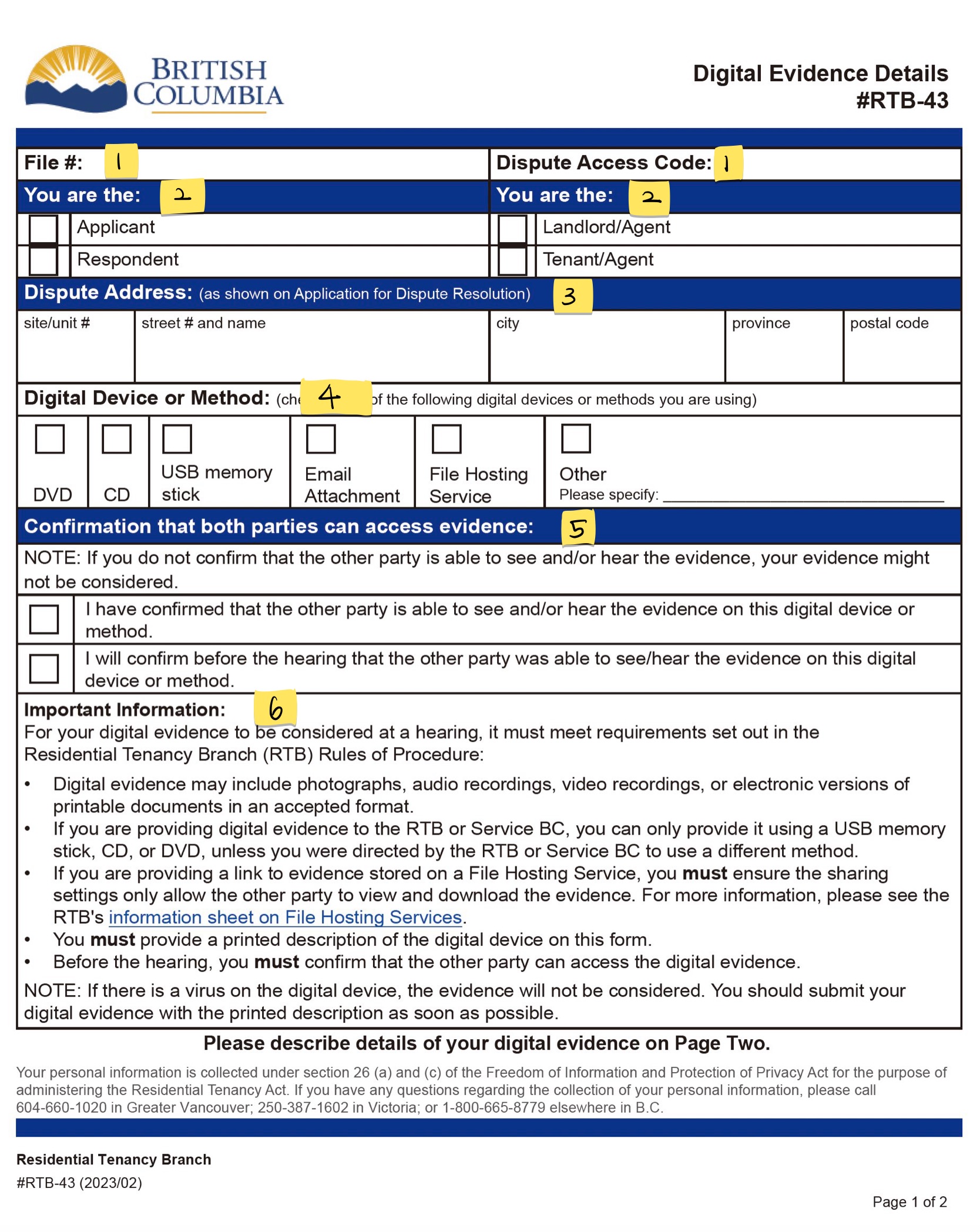 캐나다 브리티시 컬럼비아 주에서 주택 임대 관련 분쟁을 해결하기 위해 Residential Tenancy Branch (RTB)는 다양한 서식을 제공합니다. 그 중 RTB43은 디지털 증거를 제출하는 데 사용되는 중요한 문서입니다. 이 글에서는 RTB43을 작성하고 제출하는 방법에 대해 알아보겠습니다.